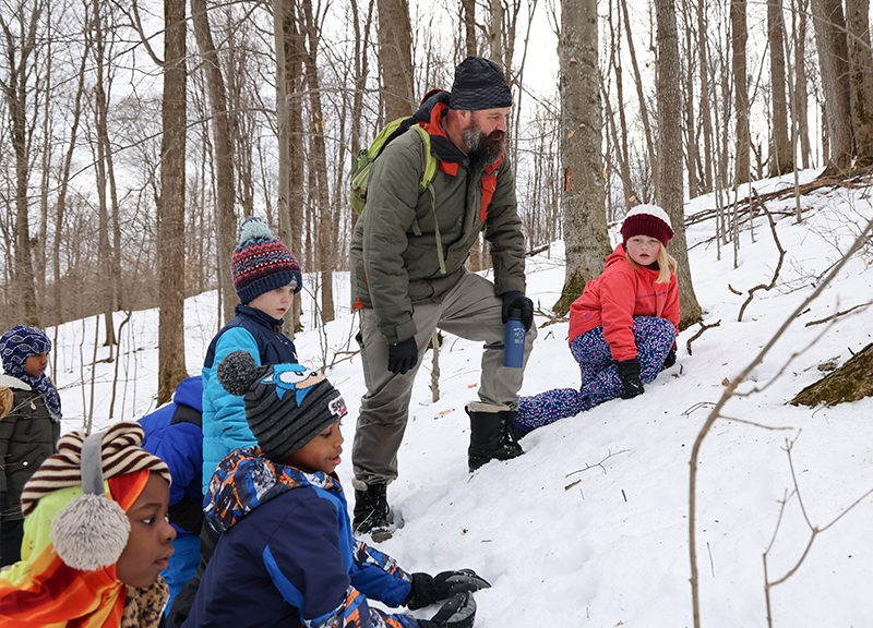 - Forest Investigation: We’ll become nature detectives as we examine the changing landscape. Search for life in the forest – in trees, in the soil, and under logs (Fall and Spring).