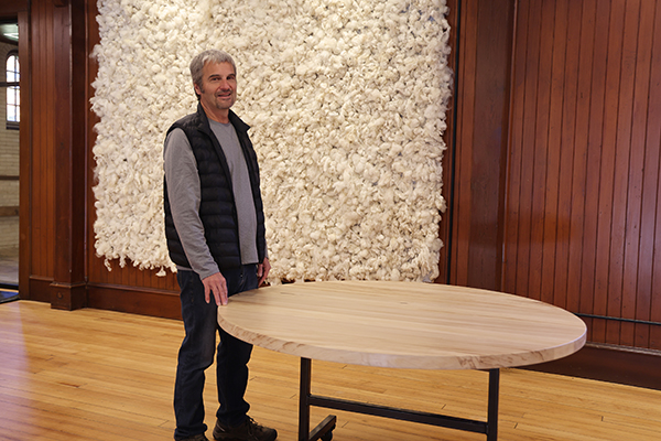 man with salt-and-pepper short hair stands in jeans next to a table with a round wooden top. A wall decoration of sheep's wool hangs behind him
