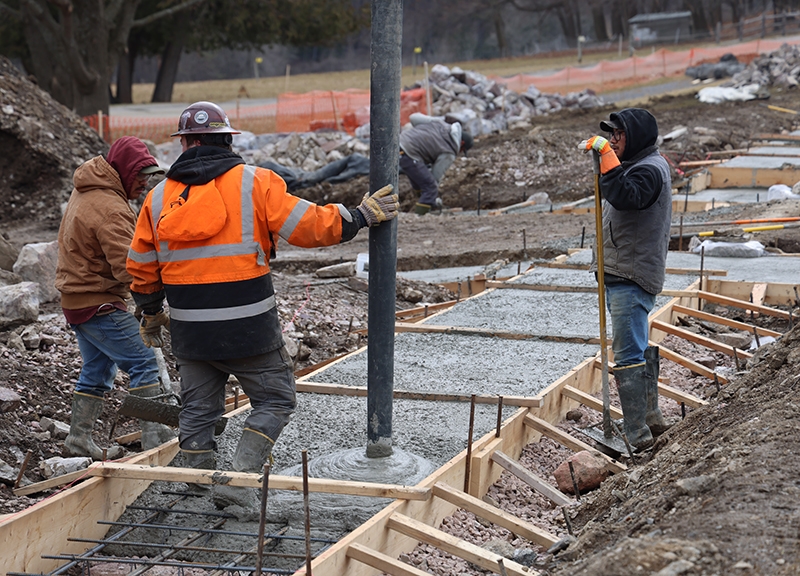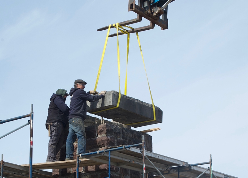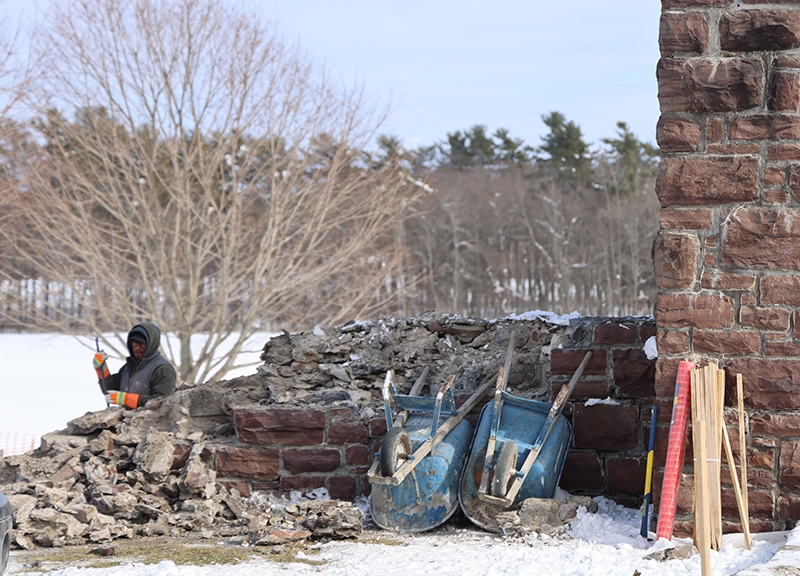 This historic rehabilitation project is being led by the masonry crew of White Falcon Solutions. In March, they brought most of the walls down to the ground (see slideshow below). The team is installing a new concrete footing, then will set and re-mortar the existing redstones around the rubble core. Finally, the capstones, carefully marked to be returned to their original locations, will be remounted with a fresh treatment of penetrating sealant to help prevent water damage in the future.